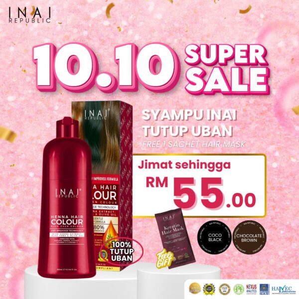 【New Arrival】INAI REPUBLIC Syampu Inai Tutup Uban Halal Size Jumbo (300 ml) Inai Pewarna Rambut Halal Henna Hair Colour – 2 Warna Tahan Lama Telus Air Mesra Wuduk Dengan Bau Strawberry – Coco Black Chocolate Brown